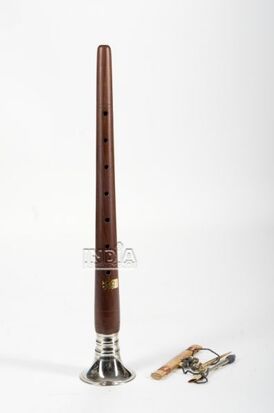 Gesamtlänge von hölzernem Spielrohr (dhari) und Blechtrichter (pyala) 38 bis 49 cm (ohne Anblasröhre und Rohrblatt)