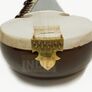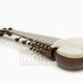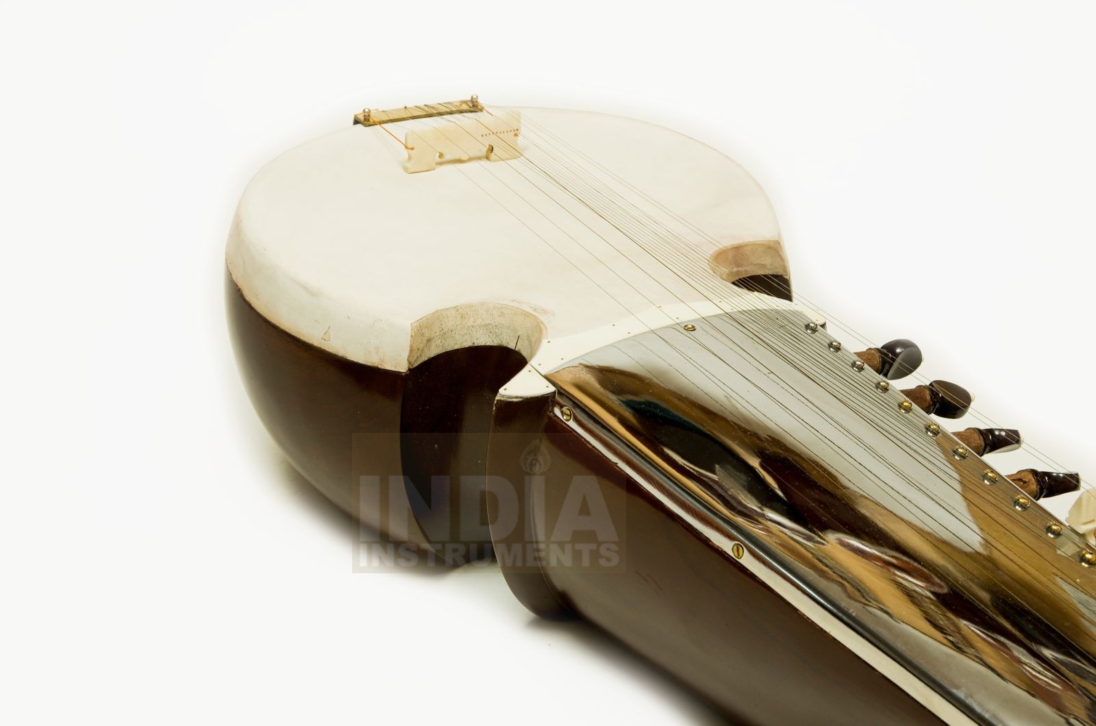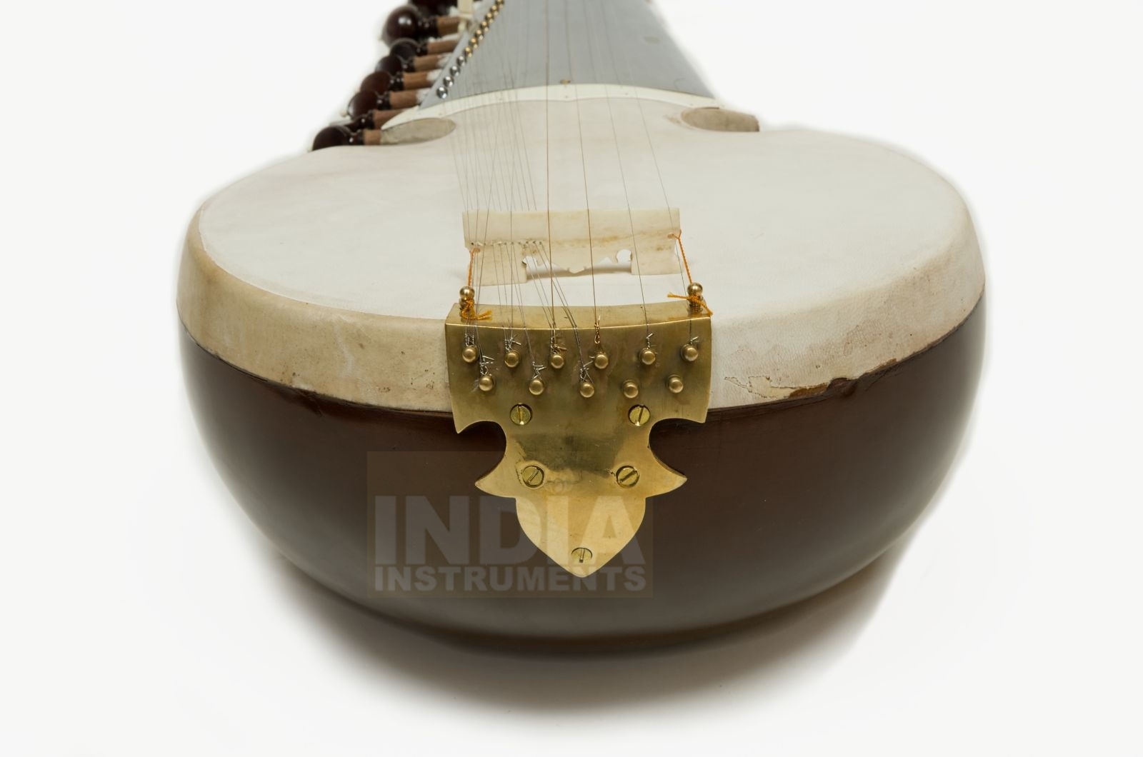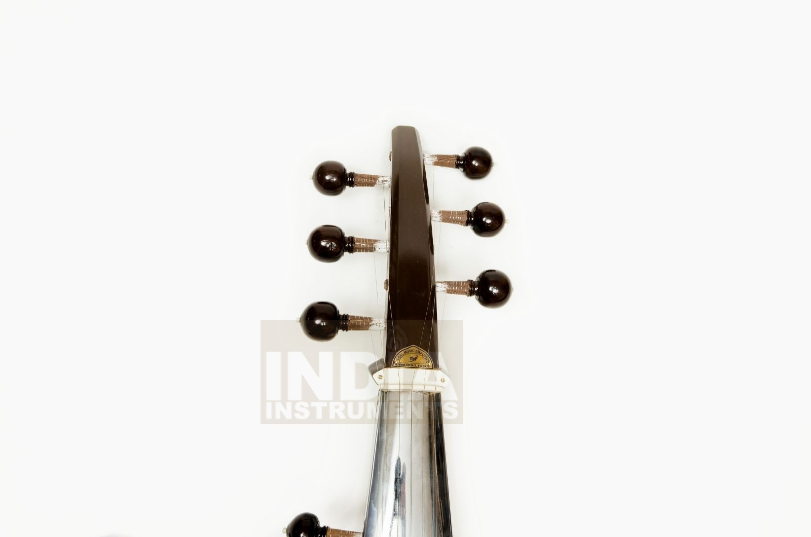 Korpus, Hals und Wirbelkasten aus mittel- bis dunkelbraun gebeiztem Tun-Holz mit hochglanzpolierten Schelllackoberflächen, Korpusbespannung mit Ziegenhaut, verchromtes bundloses Metallgriffbrett, 4 Melodiesaiten, 4 Bordunsaiten, 2 Chikarisaiten, 15 Resonanzsaiten, Saitenhalter und abschraubbarer oberer Resonator aus poliertem Messing.