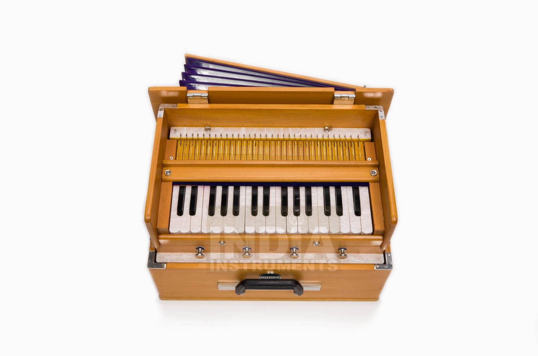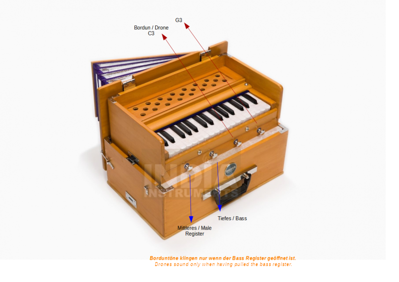 Unsere Harmoniums werden in Indien gleichschwebend temperiert nach dem internationalen Kammerton a = 440 Hertz gestimmt. Sie klingen aber hierzulande wegen des kälteren Klimas meist etwas höher bei a = 441 bis 442 Hertz. Der Unterschied ist gering und fällt selbst geschulten Ohren nicht unbedingt auf.