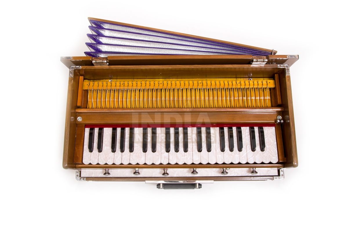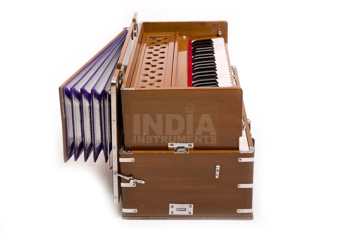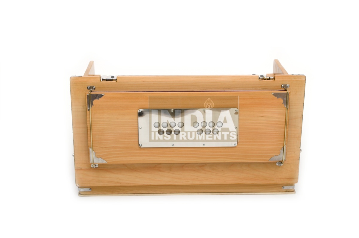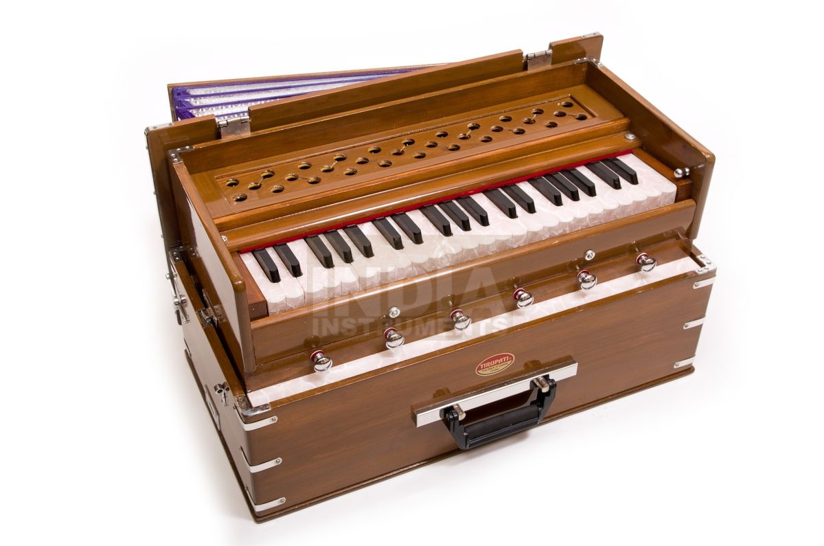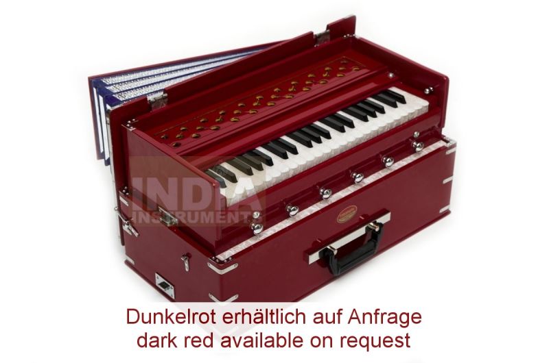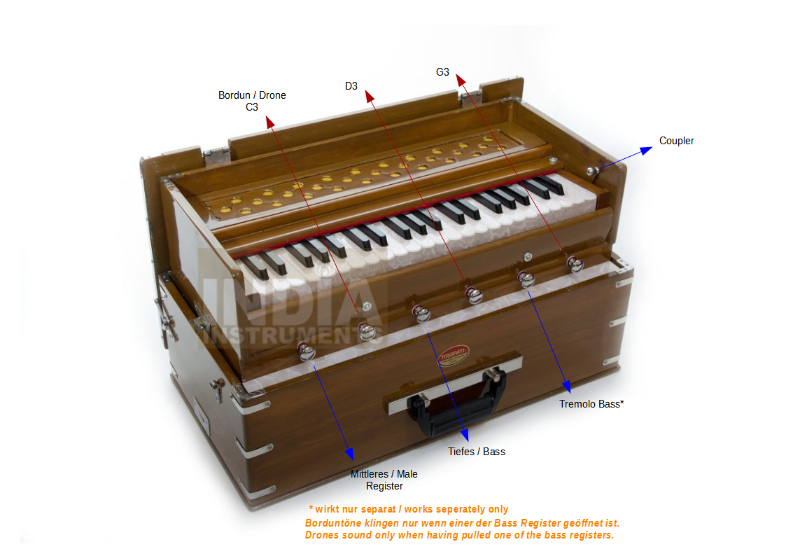 Die Bauart mit umklappbarem Balg, Koffergehäuse, Doppelzungen und einfachen Stabtasten ist dank Krishna Das oder Jai Uttal ein Klassiker in der westlichen Kirtanszene. Die Einfachheit macht es ebenso preiswert wie robust. Doppelzungen, Oktavkopplung und drei Borduntöne sorgen für vollen, brillanten Klang. Und dank des umklappbaren Balgs lässt es sich so kompakt zusammenlegen, dass man es noch gut einhändig tragen kann.