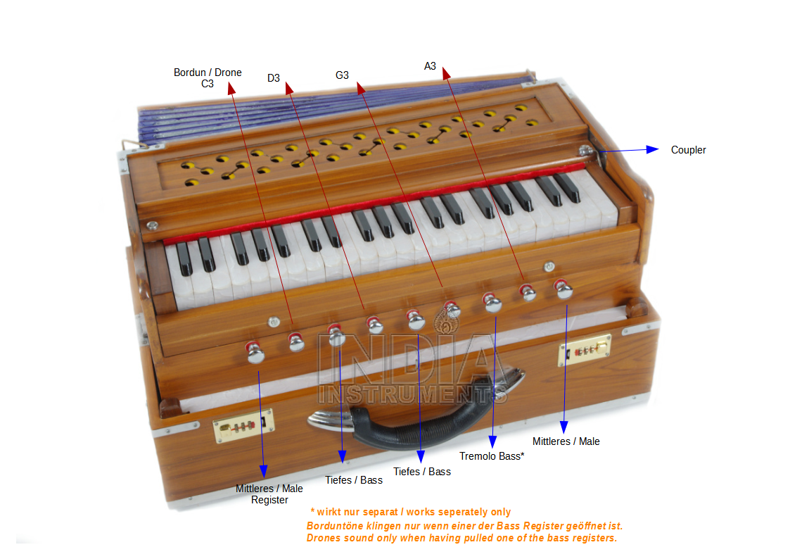 Unsere Harmoniums werden in Indien gleichschwebend temperiert nach dem internationalen Kammerton a = 440 Hertz gestimmt. Sie klingen aber hierzulande wegen des kälteren Klimas meist etwas höher bei a = 441 bis 442 Hertz. Der Unterschied ist gering und fällt selbst geschulten Ohren nicht unbedingt auf.