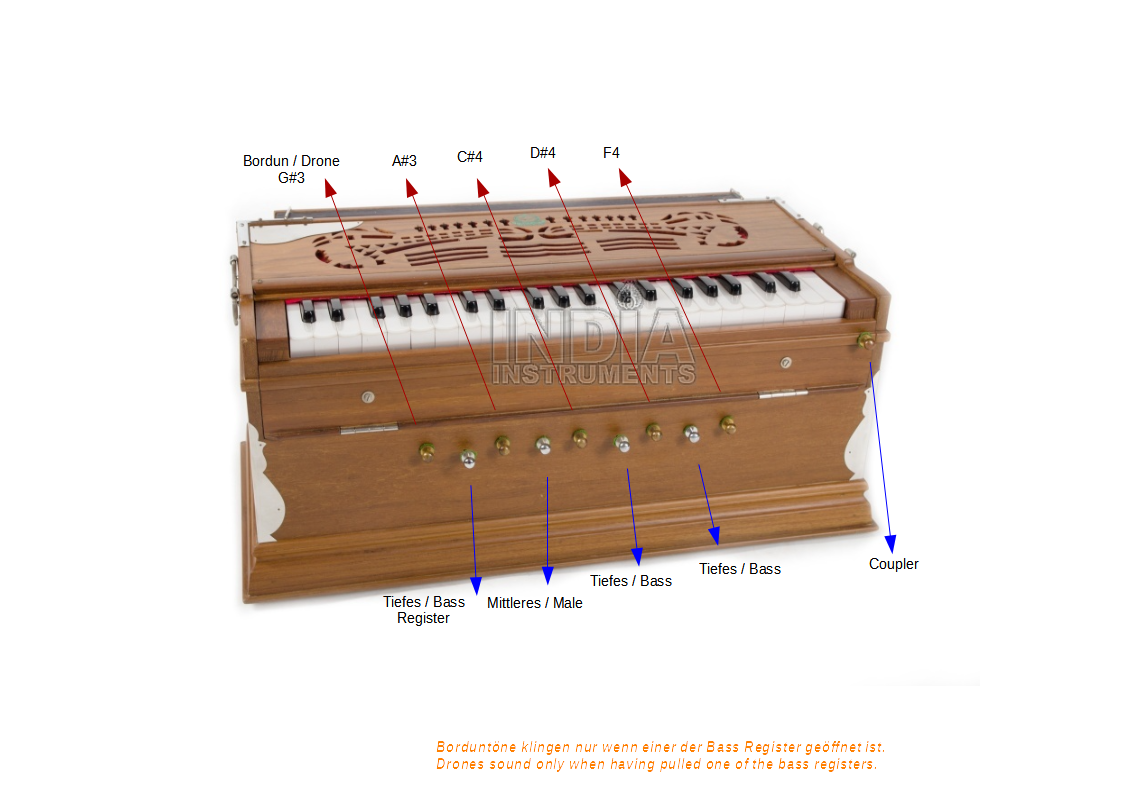 Unsere Harmoniums werden in Indien gleichschwebend temperiert nach dem internationalen Kammerton a = 440 Hertz gestimmt. Sie klingen aber hierzulande wegen des kälteren Klimas meist etwas höher bei a = 441 bis 442 Hertz. Der Unterschied ist gering und fällt selbst geschulten Ohren nicht unbedingt auf.