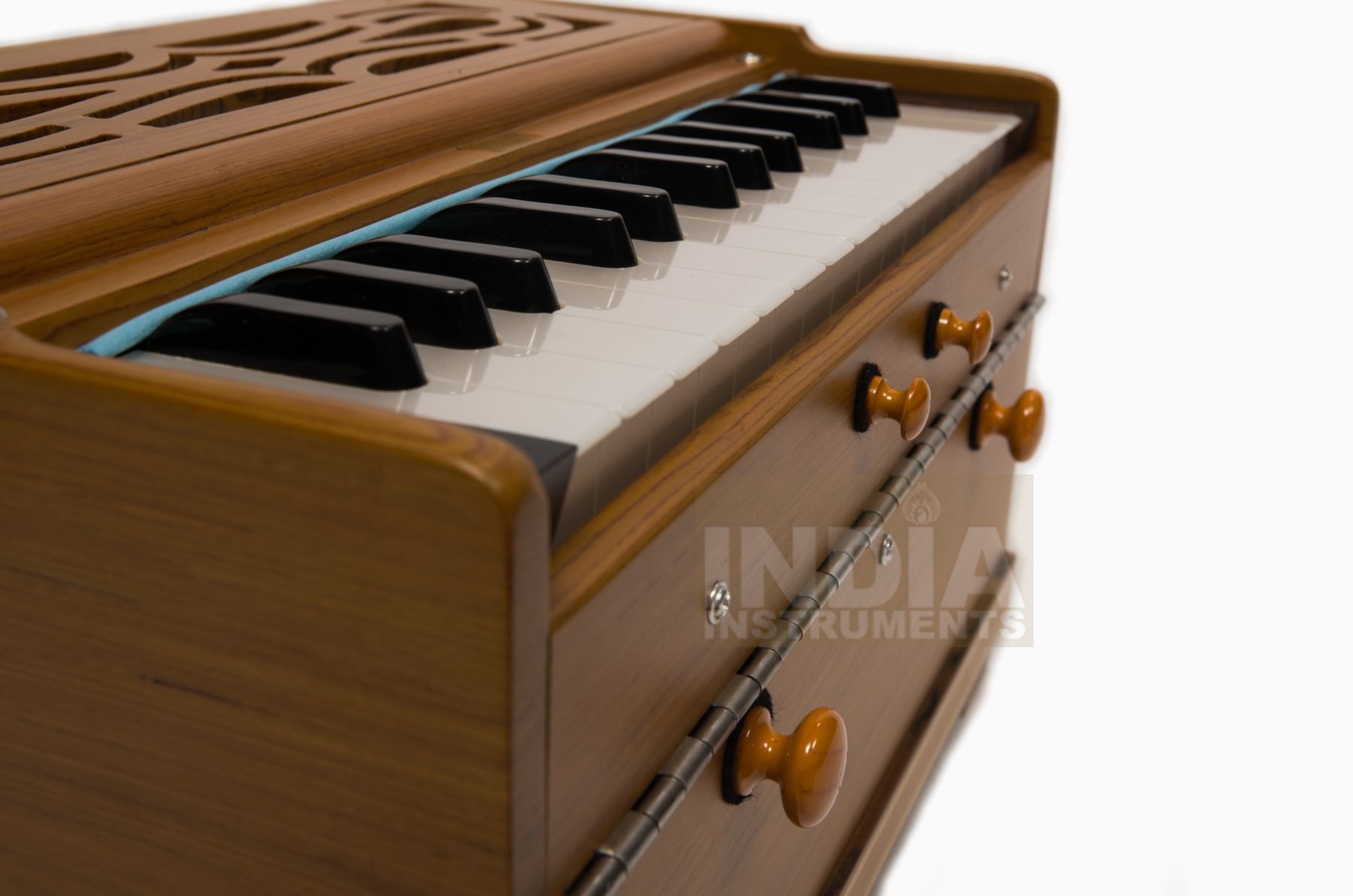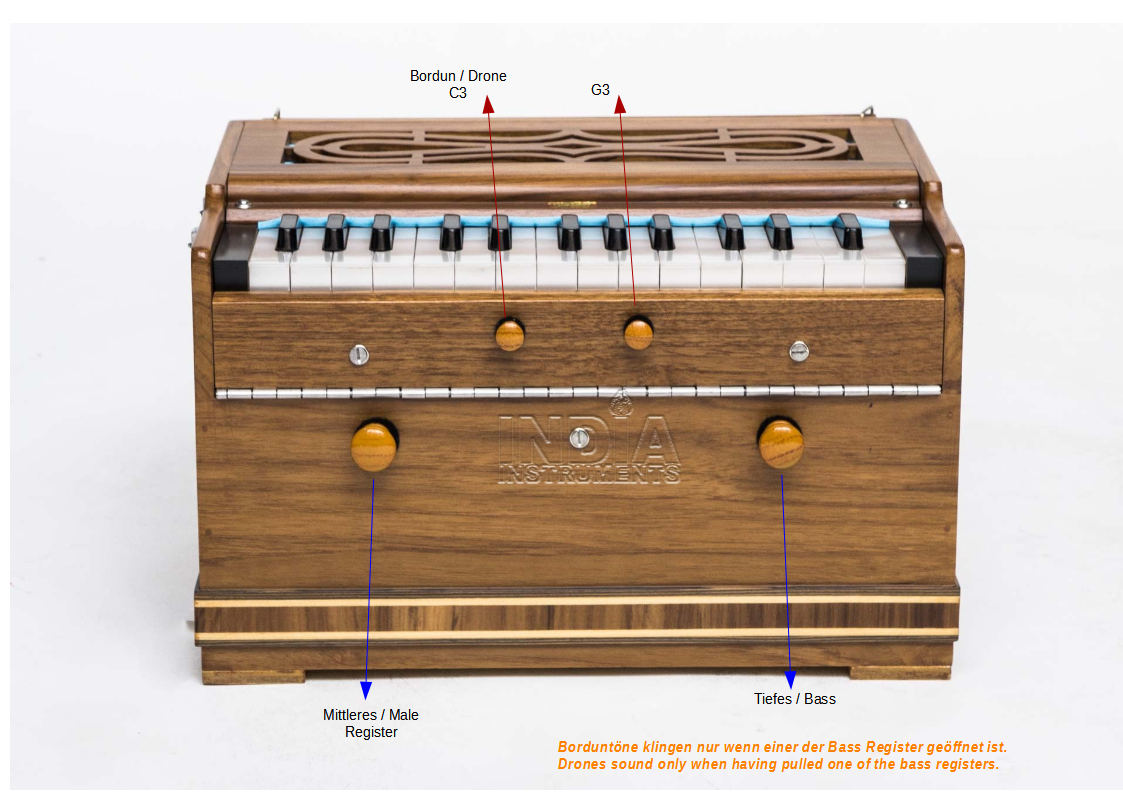 Unsere Harmoniums werden in Indien gleichschwebend temperiert nach dem internationalen Kammerton a = 440 Hertz gestimmt. Sie klingen aber hierzulande wegen des kälteren Klimas meist etwas höher bei a = 441 bis 442 Hertz. Der Unterschied ist gering und fällt selbst geschulten Ohren nicht unbedingt auf.