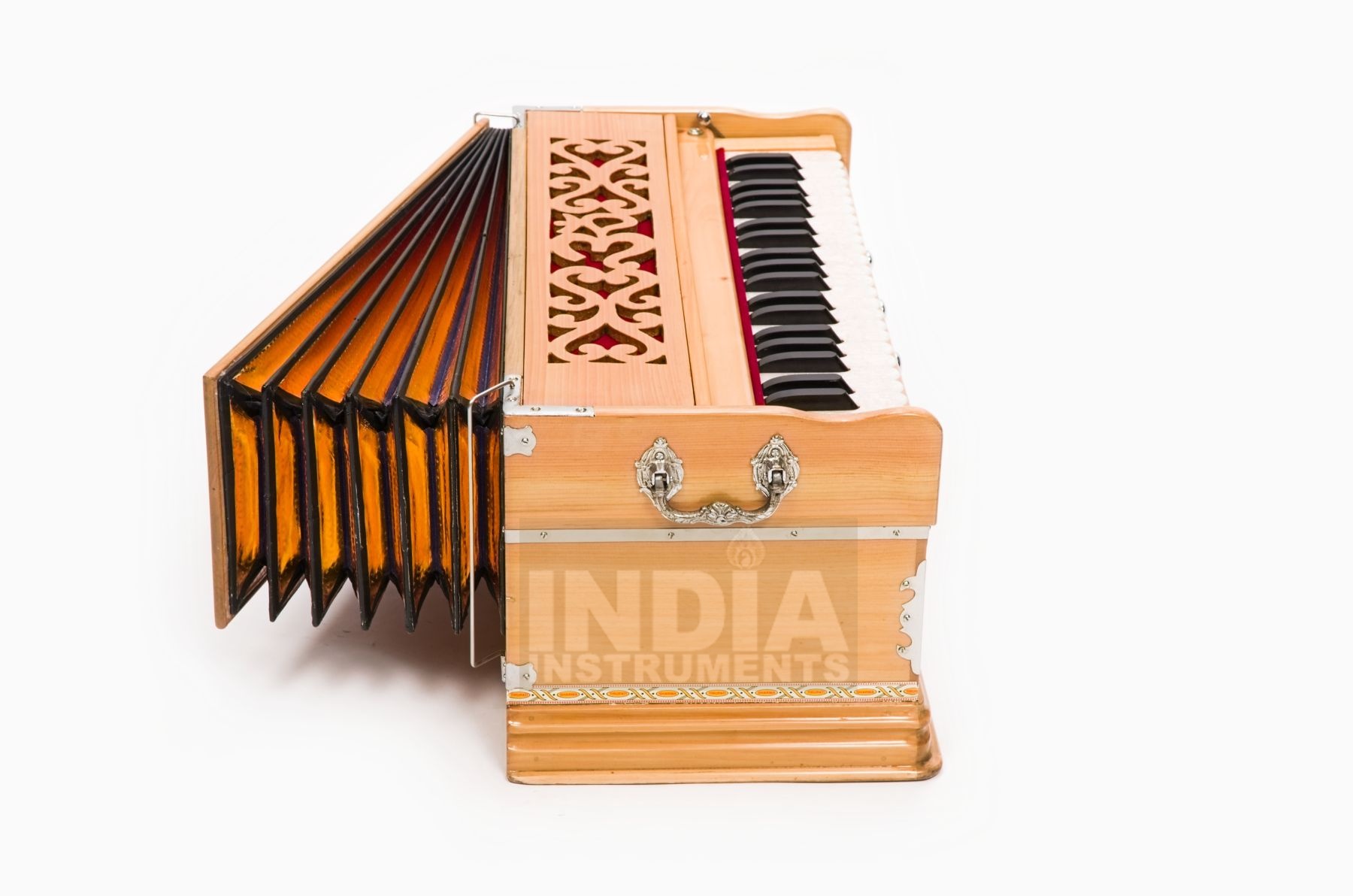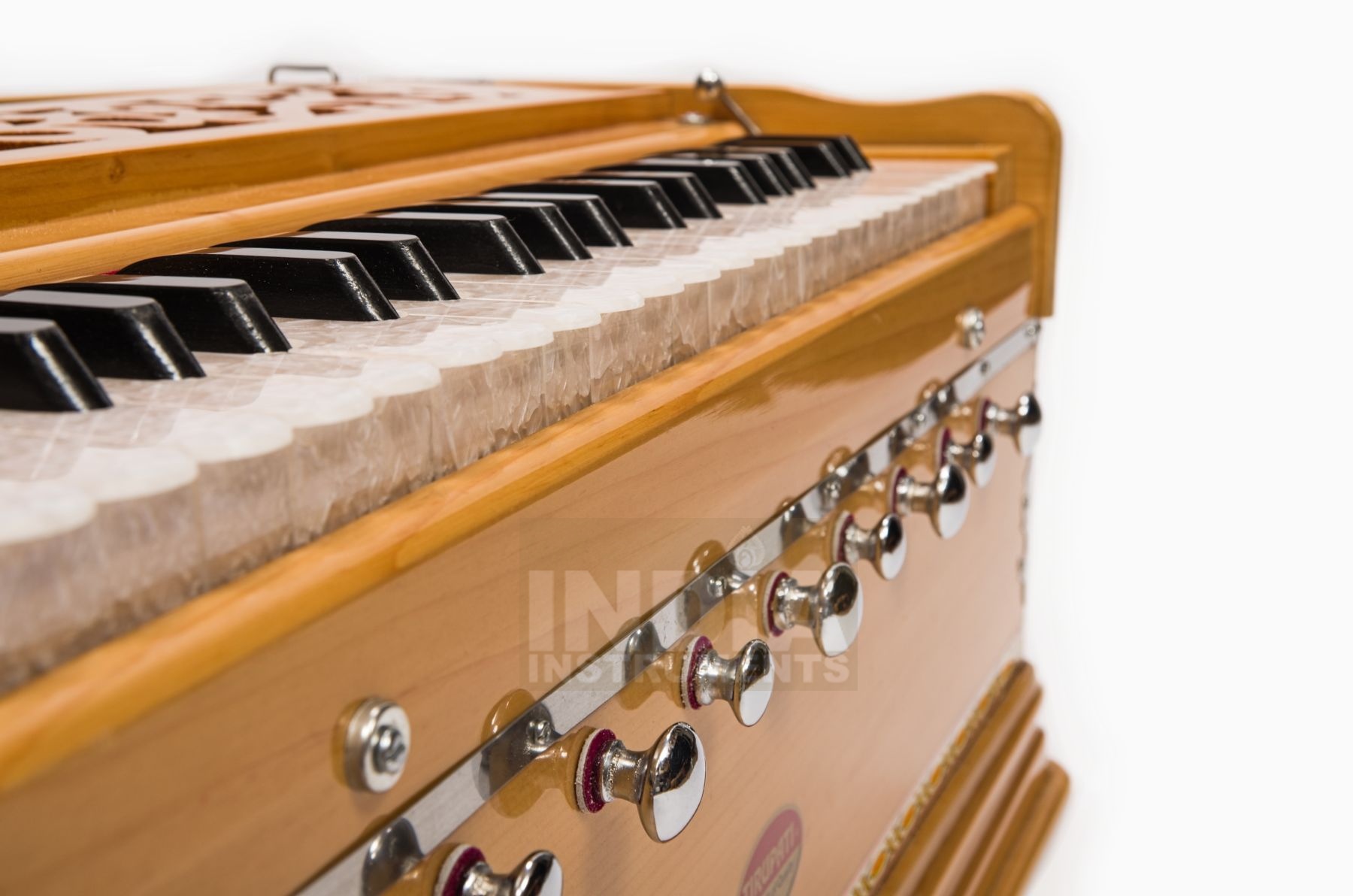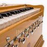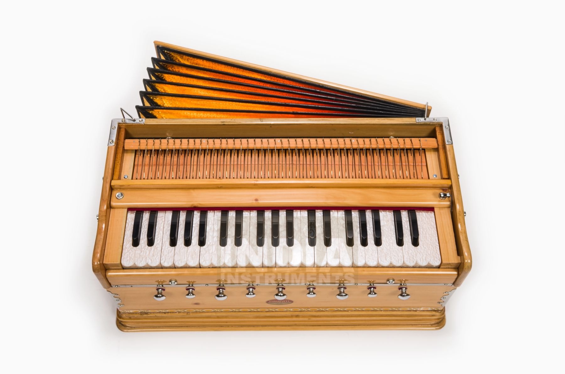 Die Bauweise des Tirupati Premium OM entspricht unseren Standard Harmoniums. Es hat aber 3 Töne mehr Umfang nach oben und dank des größeren Kastens mehr Luftvolumen für mehr Sustain und Dynamik. Außerdem hat es eine Oktavkopplung, mit der automatisch die höhere Oktave mitgespielt werden kann. Das ergibt einen besonders reichen, brillanten und tragfähigen Klang. Dank der Verwendung von hochwertigeren Zungen und Hölzern und einer sorgfältigeren Verarbeitung ist das Tirupati Premium OM klanglich auch ausgewogener und runder, spielt sich weicher und macht auch optisch einen besseren Eindruck. Ein gutes Instrument für Menschen mit etwas höheren Ansprüchen.