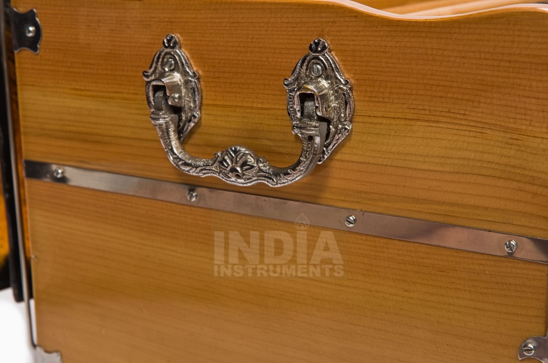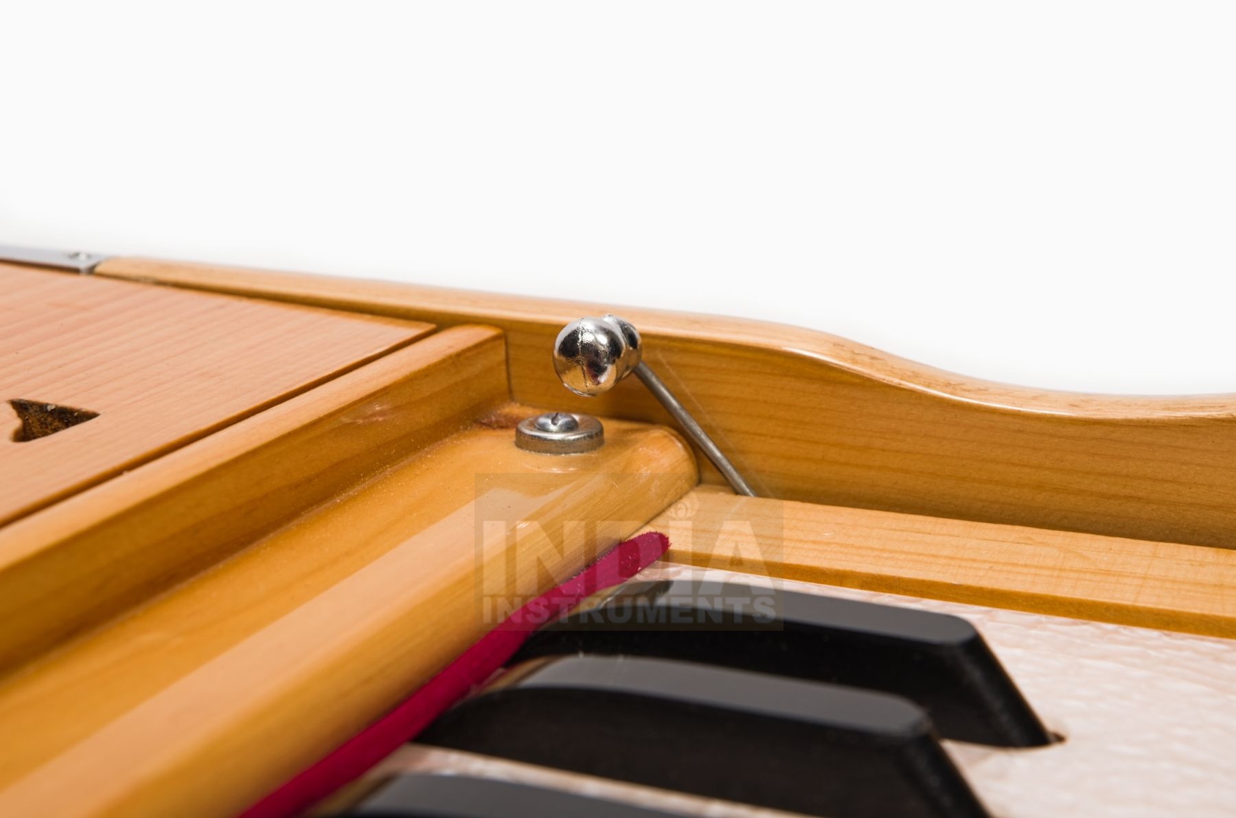 Kiefernholz wird vor allem in der Gegend um Delhi für Harmoniums verwendet. Es ist leichter, aber auch wesentlich weicher als das in Mumbai und Kolkata gebräuchlichere Teakholz. Deswegen bekommen viele Kiefernholz-Harmoniums schon in der Herstellung und beim Transport nach Europa kleine Dellen oder andere Schönheitsfehler - die sind materialbedingt und nicht als Mangel anzusehen.