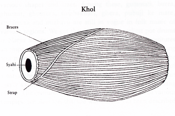 The khol is a barrel shaped asymmetrical drum. Its two faces are of different sizes, and it seems to resemble the ancient Gopuchha shape of drums, as described by Bharat in his Natya Shastra. The right face of the drum, which is three to five inches in diameter, has a high pitch and produces a metallic sound, whereas the left face, which is six to eight inches in diameter, produces a lower bass sound. The relation between the two faces is almost of an octave, i.e. S-S. The drum is made of a special clay, which is available on the banks of the Ganges in Bengal. The two faces of the drum are covered with two layers of cow leather, one full and the other on the outer periphery of the faces. These parchments are held by braids, both of which are connected with thin leather strips equally distributed into thirty-two spaces. Nowadays, in some khols cotton strips are also used. The entire instrument is painted with a paste of flour mixed with red colour. The syahi or the black permanent mixture, that provides a good tonal quality, is also put on the central portion of the right face of the khol like other percussion instruments, but the preparation of this mixture is quite different from the syahi of the tabia or pakhavaj. The syahi used for khol is prepared from mud and rice dust with a tiny portion of iron fillings. The left face of the drum is loaded with mud and rice dust paste in the centre, and is painted red.
