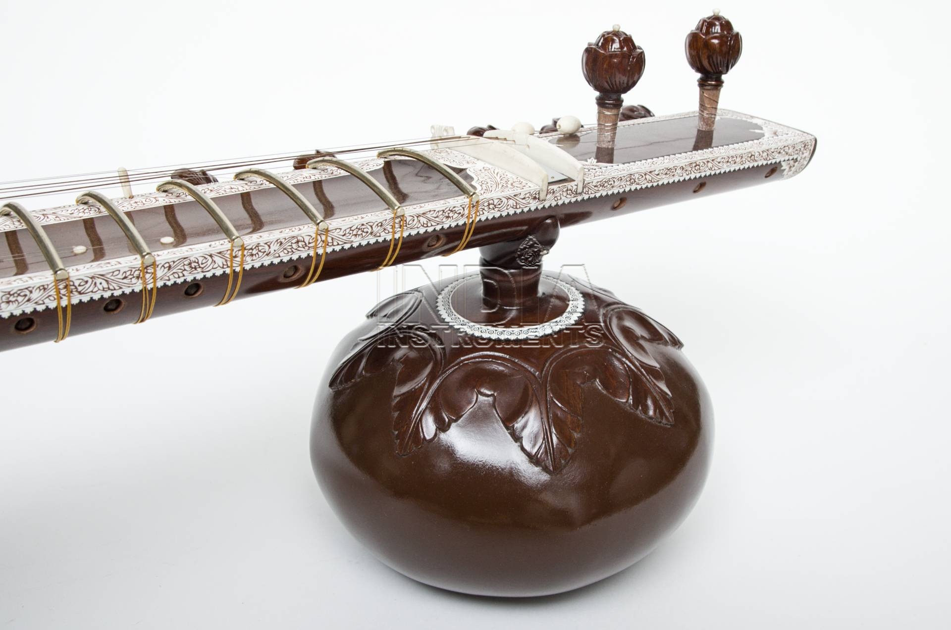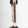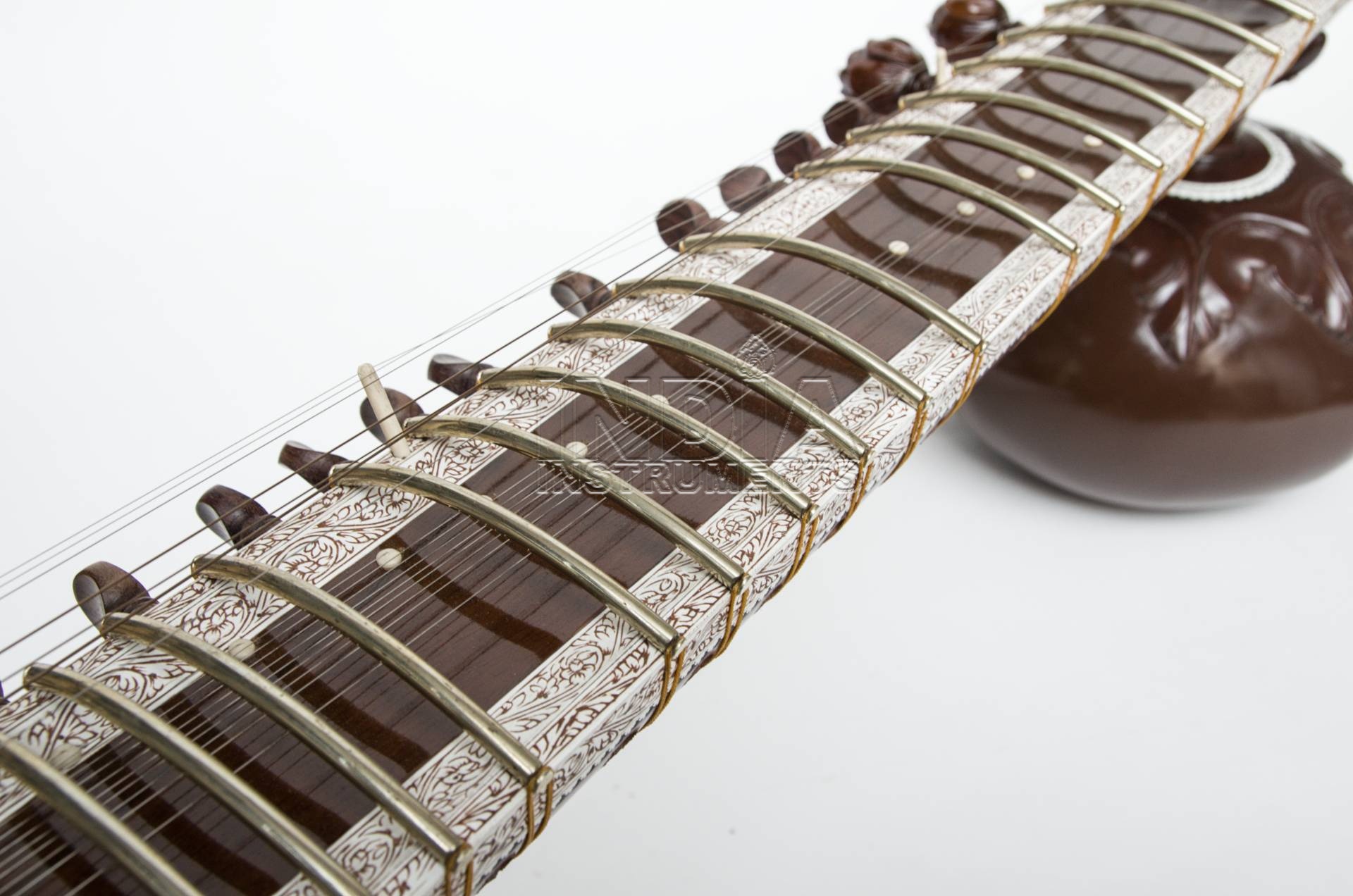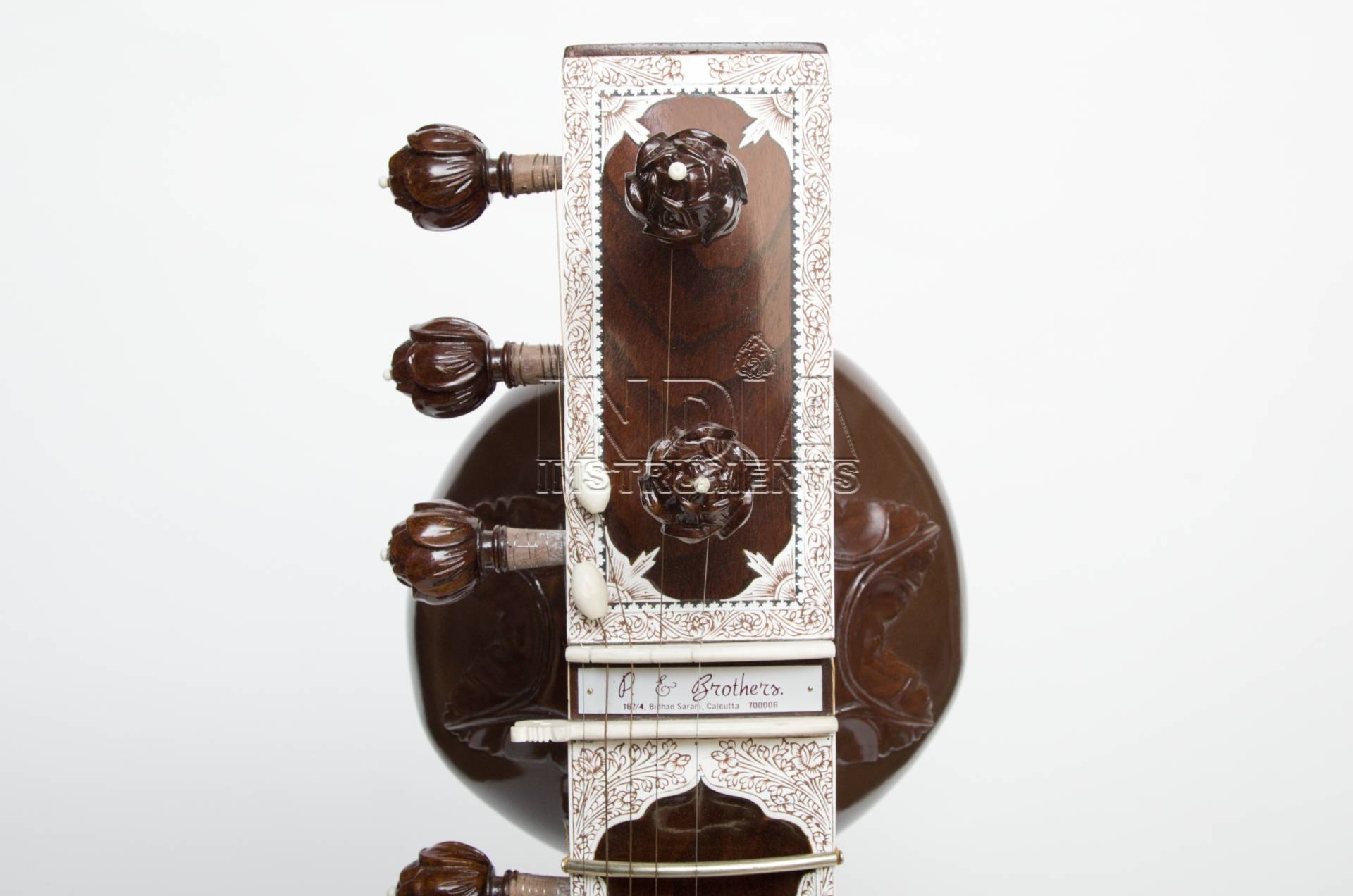 Hell gebeiztes Tun-Holz, hochglanzpolierte Schelllackoberflächen, 7 Spielsaiten, 13 Resonanzsaiten, Einlegearbeiten aus Zelluloid mit goldbraun gefärbten Gravuren, geschnitzt verzierter Halsansatz (gulab patta), Kunststoffbrücken. Der abschraubbare obere zweite Resonator (Tumba) ist aus Kürbis gefertigt und bringt dadurch bei minimalem Gewicht deutliche zusätzliche Resonanz vor allem im unteren Frequenzbereich. Zwei Haken am obersten Bund erlauben das "Weghaken" der beiden tiefsten Spielsaiten; damit wird verhindert, dass bei kräftigem schnellem Spiel in mittlerer und hoher Lage die tiefen Saiten ungewollt mit angeschlagen oder in Resonanz versetzt werden und dadurch das Klangbild abdunkeln und verwischen. Resonanzsaitenführung in den Hals in stumpfem Winkel über einrißsichere Minibrücken; dadurch reduzierte Saitenreißneigung.