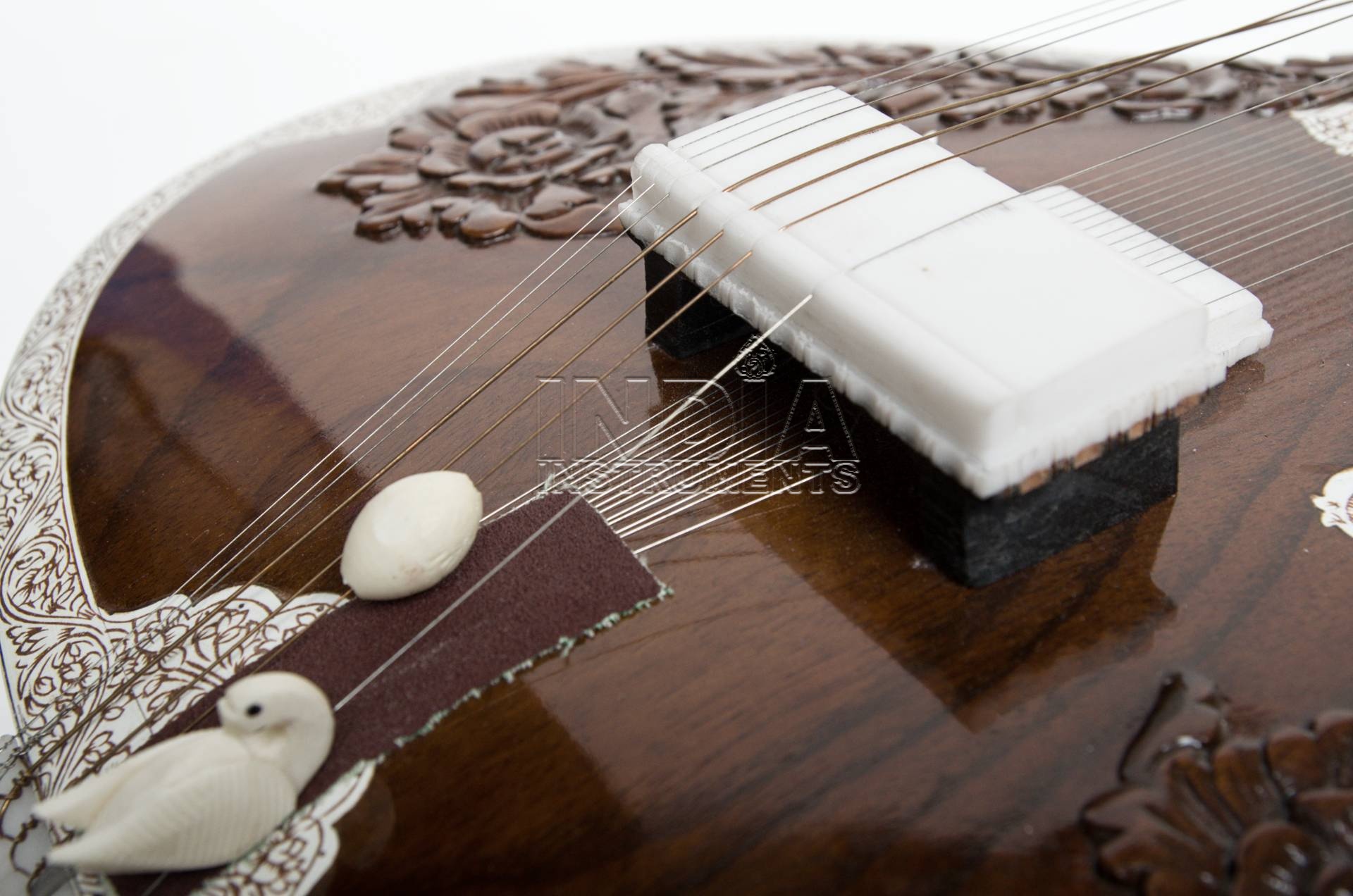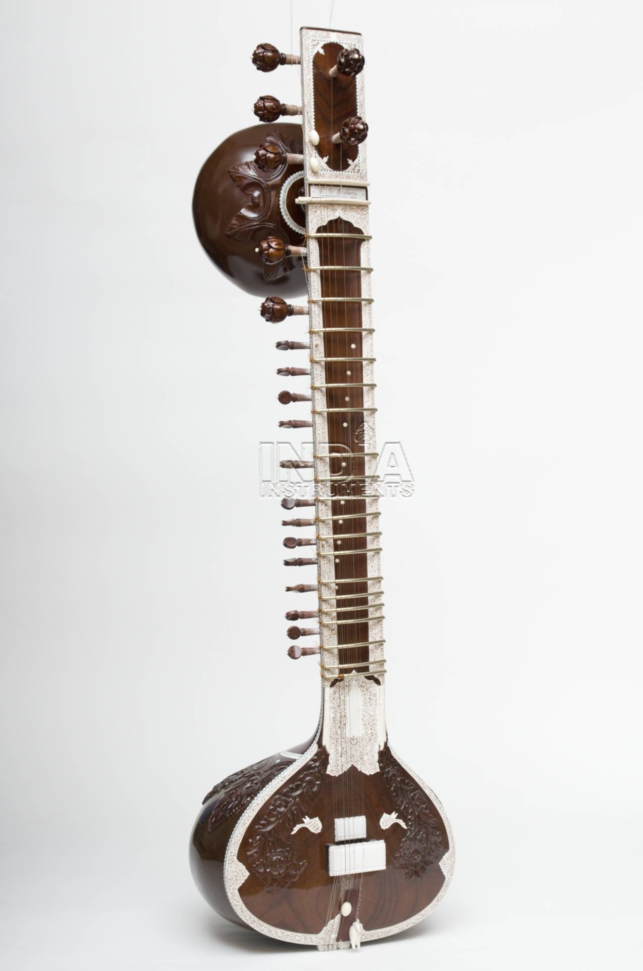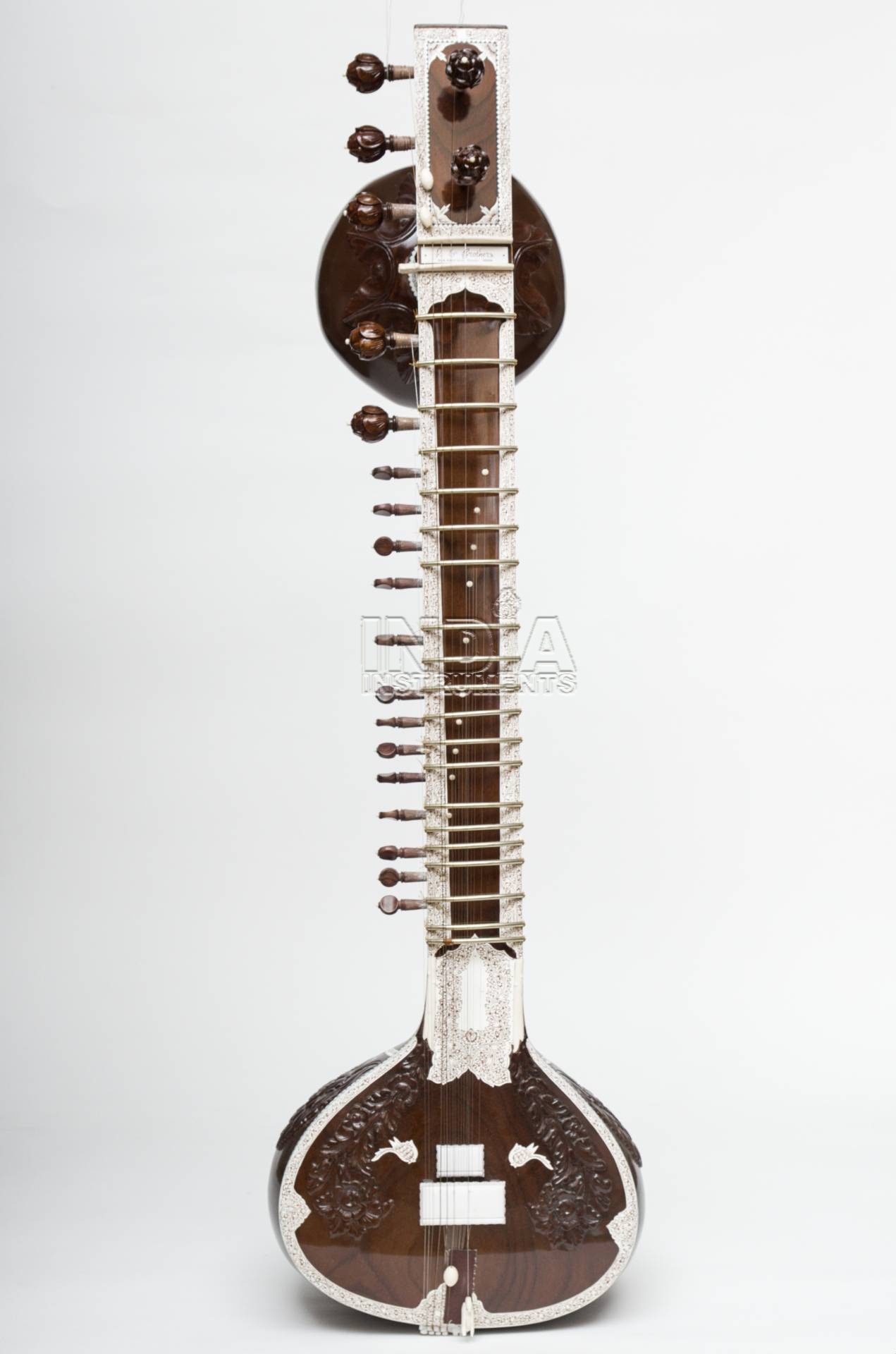 Hell gebeiztes Tun-Holz, hochglanzpolierte Schelllackoberflächen, 7 Spielsaiten, 13 Resonanzsaiten, Einlegearbeiten aus Zelluloid mit goldbraun gefärbten Gravuren, geschnitzt verzierter Halsansatz (gulab patta), Kunststoffbrücken. Der abschraubbare obere zweite Resonator (Tumba) ist aus Kürbis gefertigt und bringt dadurch bei minimalem Gewicht deutliche zusätzliche Resonanz vor allem im unteren Frequenzbereich. Zwei Haken am obersten Bund erlauben das "Weghaken" der beiden tiefsten Spielsaiten; damit wird verhindert, dass bei kräftigem schnellem Spiel in mittlerer und hoher Lage die tiefen Saiten ungewollt mit angeschlagen oder in Resonanz versetzt werden und dadurch das Klangbild abdunkeln und verwischen. Resonanzsaitenführung in den Hals in stumpfem Winkel über einrißsichere Minibrücken; dadurch reduzierte Saitenreißneigung.