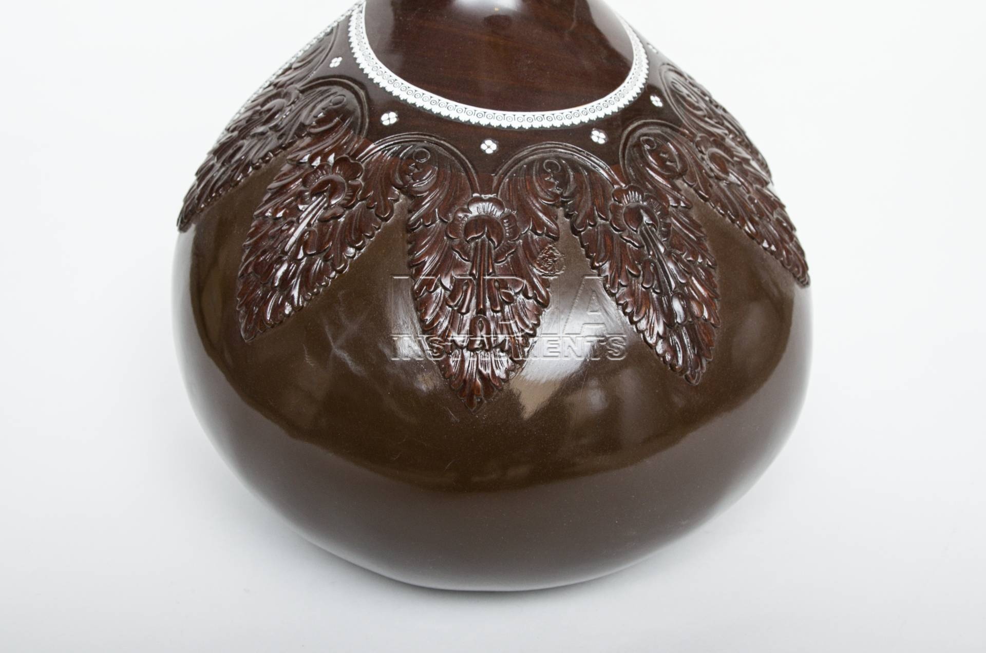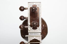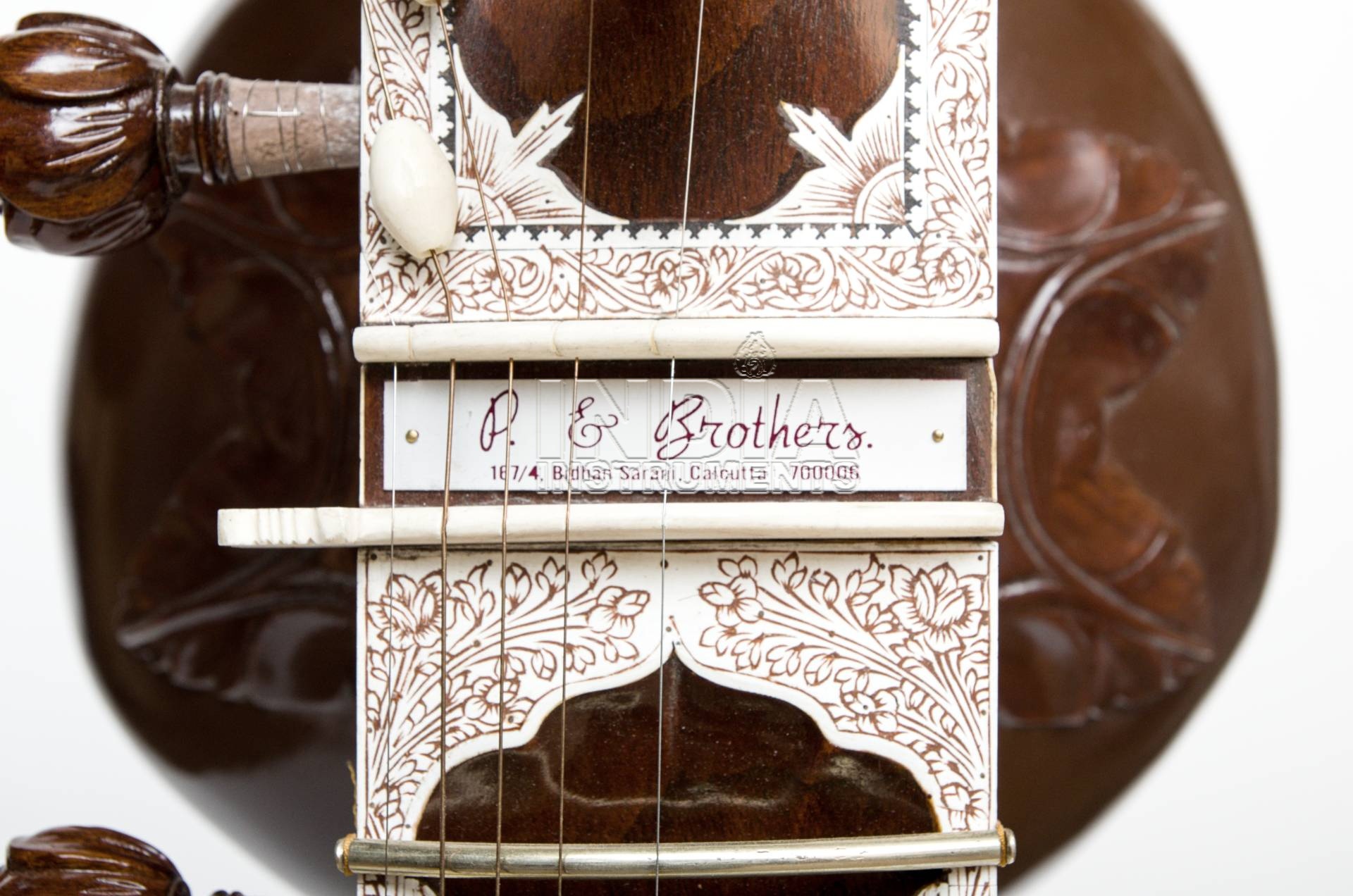 Im Vergleich mit dem Single Deco Modell aus derselben Werkstatt ist sie nicht nur aufwändiger verziert, sondern wird auch aus sorgfältiger ausgesuchten und abgelagerten Hölzern und mit einem höheren Perfektionsanspruch gebaut. Das Ergebnis ist ein in sich absolut stimmiges Instrument mit einem besonders runden und ausgewogenen Klang. Die full deco Sitar von P. & Brothers ist damit ideal für Musiker mit ausgeprägt hohem Qualitätsanspruch, die einen vollen, kräftigen, warmen Ton mit gutem Sustain bevorzugen. Die etwas dünnere Korpusdecke (Tabli) gibt schon bei mittelstarken Anschlägen einen relativ lauten Ton und spricht auch auf sehr zarte Anschläge noch fein differenziert an. Bei sehr kräftigen Anschlägen kann der Klang allerdings etwas polterig werden. Der obere zweite Resonator (Tumba) ist aus Kürbis gefertigt und bringt dadurch bei minimalem Gewicht deutliche zusätzliche Resonanz vor allem im unteren Frequenzbereich.