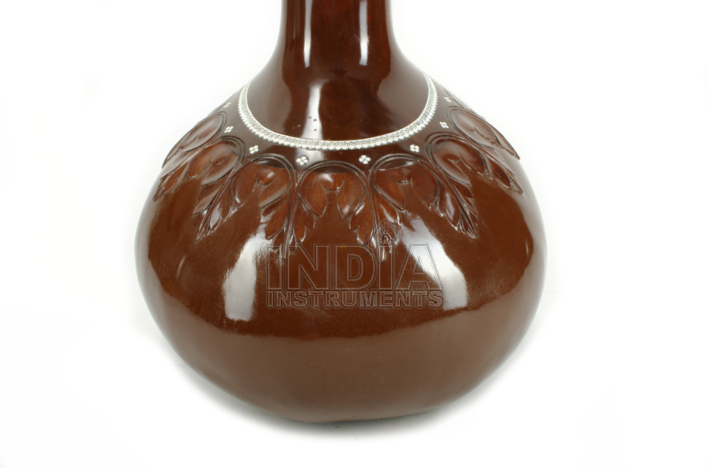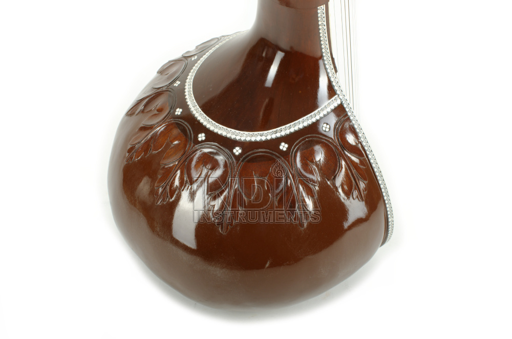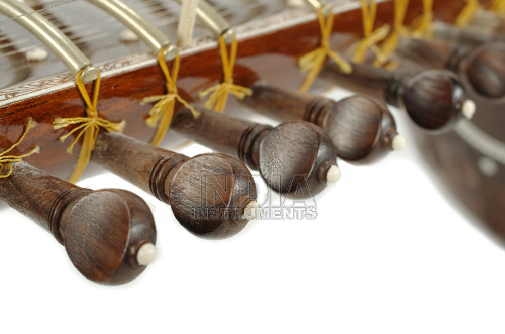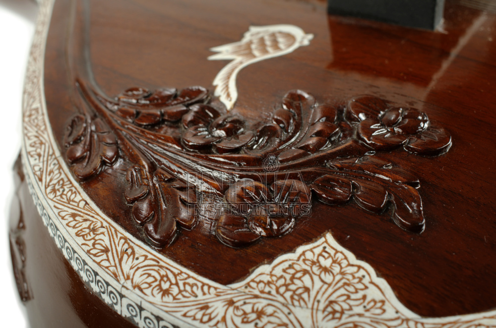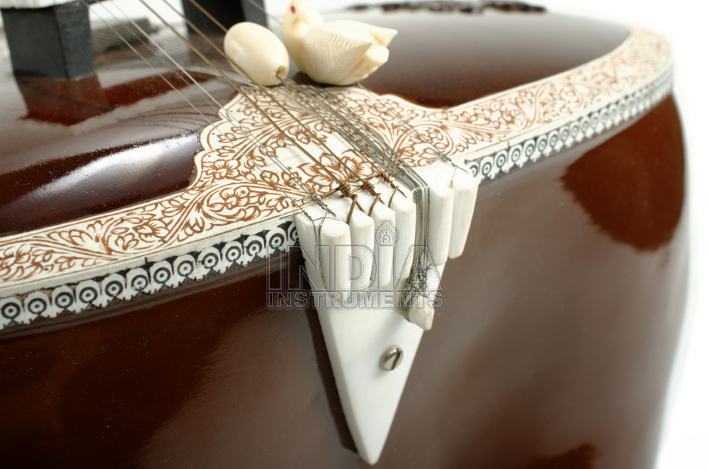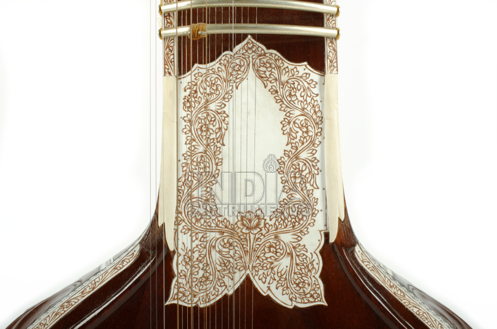 Hell gebeiztes Tun-Holz, hochglanzpolierte Schelllackoberflächen, 7 Spielsaiten, 13 Resonanzsaiten, Einlegearbeiten aus Zelluloid mit goldbraun gefärbten Gravuren, einfach verzierter Halsansatz, Kunststoffbrücken. Der abschraubbare obere zweite Resonator (Tumba) ist aus Kürbis gefertigt und bringt dadurch bei minimalem Gewicht deutliche zusätzliche Resonanz vor allem im unteren Frequenzbereich. Zwei Haken am obersten Bund erlauben das "Weghaken" der beiden tiefsten Spielsaiten; damit wird verhindert, dass bei kräftigem schnellem Spiel in mittlerer und hoher Lage die tiefen Saiten ungewollt mit angeschlagen oder in Resonanz versetzt werden und dadurch das Klangbild abdunkeln und verwischen. Resonanzsaitenführung in den Hals in stumpfem Winkel über einrißsichere Minibrücken; dadurch reduzierte Saitenreißneigung.