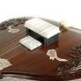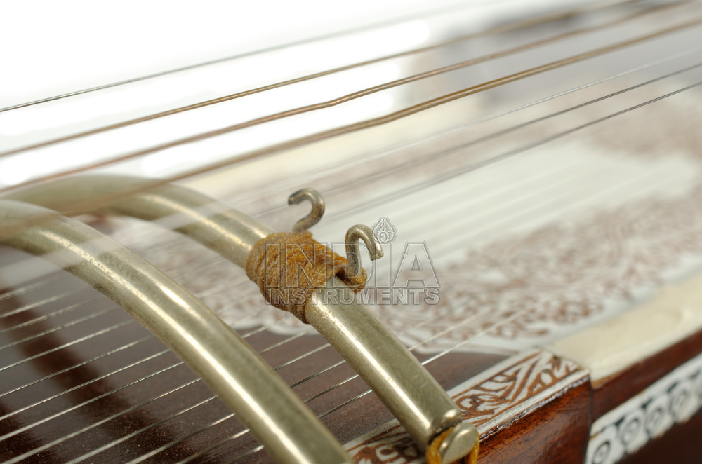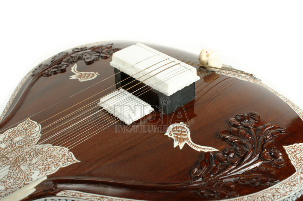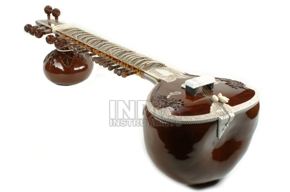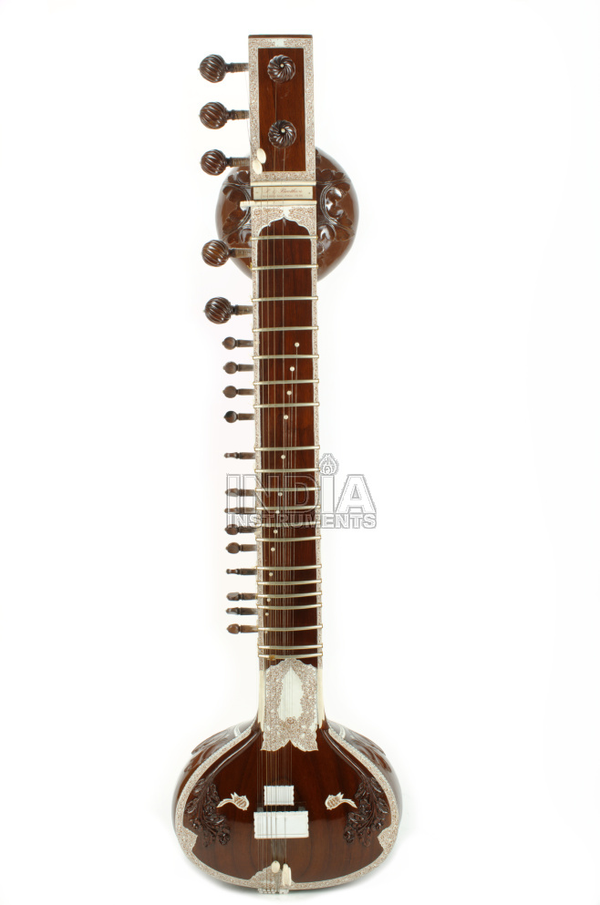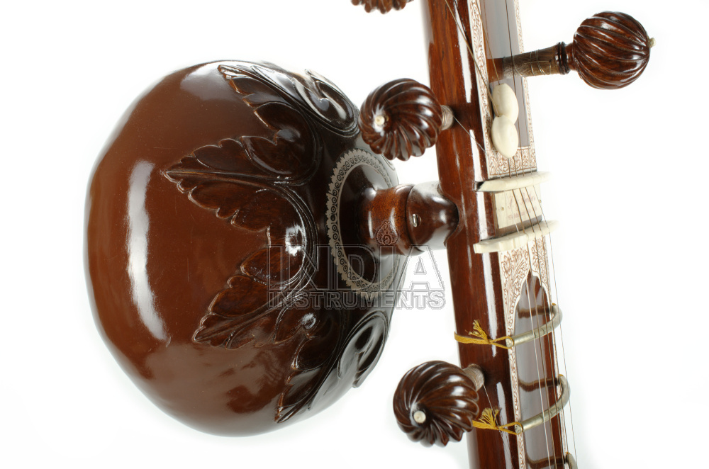 Hell gebeiztes Tun-Holz, hochglanzpolierte Schelllackoberflächen, 7 Spielsaiten, 13 Resonanzsaiten, Einlegearbeiten aus Zelluloid mit goldbraun gefärbten Gravuren, einfach verzierter Halsansatz, Kunststoffbrücken. Der abschraubbare obere zweite Resonator (Tumba) ist aus Kürbis gefertigt und bringt dadurch bei minimalem Gewicht deutliche zusätzliche Resonanz vor allem im unteren Frequenzbereich. Zwei Haken am obersten Bund erlauben das "Weghaken" der beiden tiefsten Spielsaiten; damit wird verhindert, dass bei kräftigem schnellem Spiel in mittlerer und hoher Lage die tiefen Saiten ungewollt mit angeschlagen oder in Resonanz versetzt werden und dadurch das Klangbild abdunkeln und verwischen. Resonanzsaitenführung in den Hals in stumpfem Winkel über einrißsichere Minibrücken; dadurch reduzierte Saitenreißneigung.