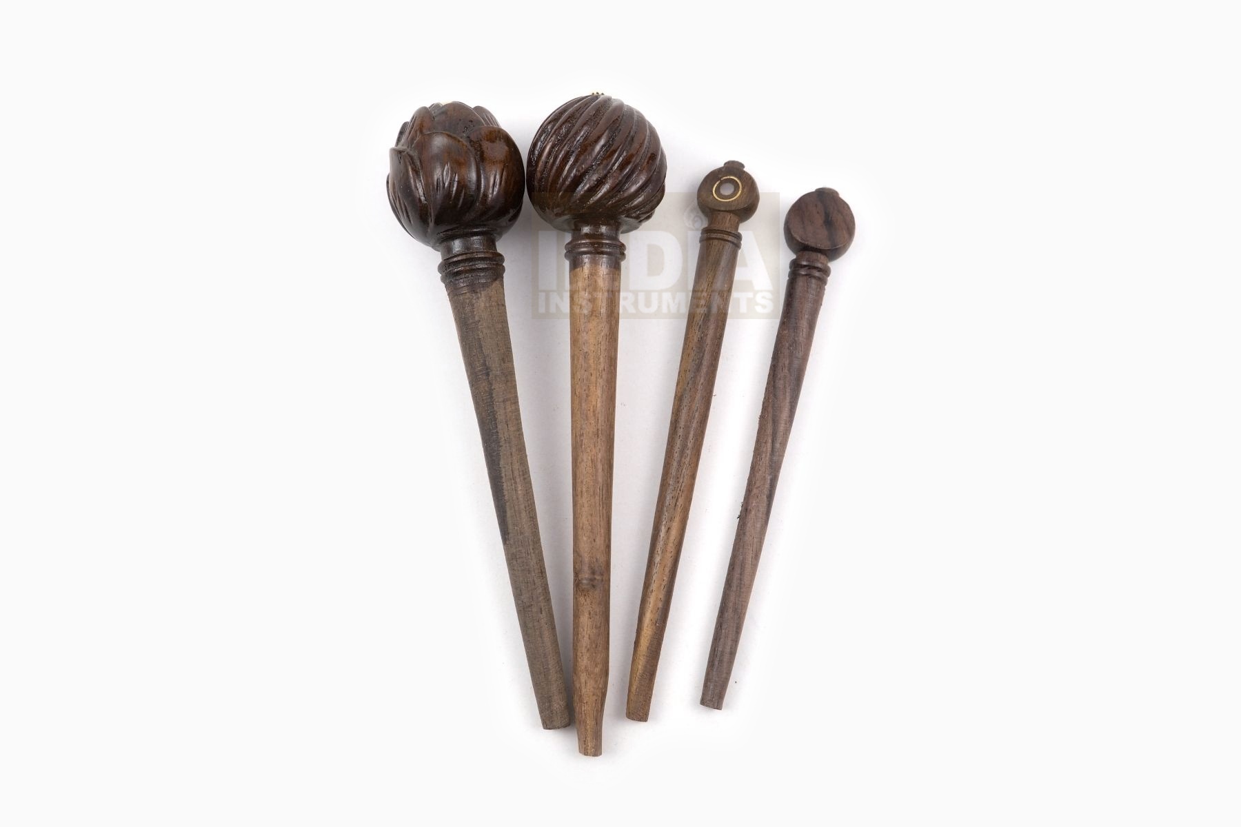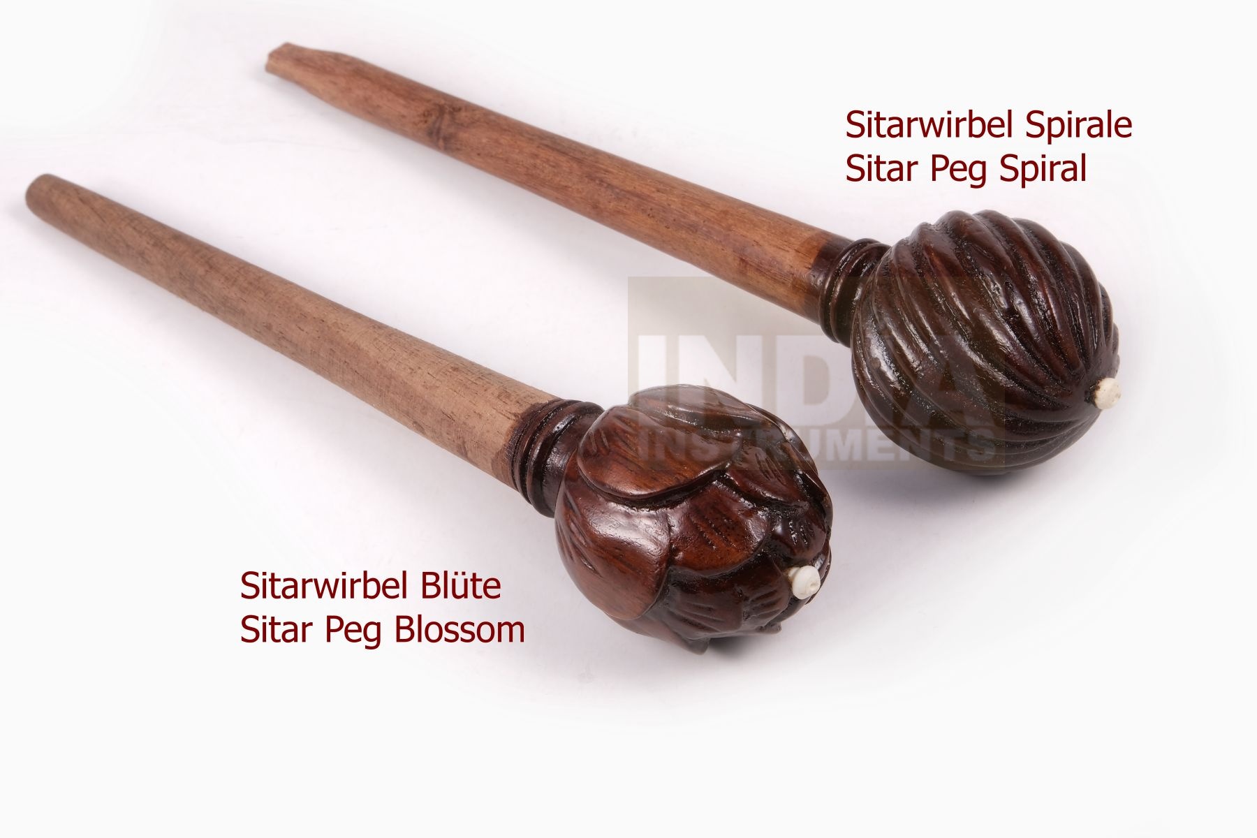 Unsere Wirbelrohlinge für indische Saiteninstrumente sind in einem Stück aus indischen Harthölzern gefertigt. Sie bestehen aus einem konisch zulaufenden Stab, der in den Instrumentenkörper gesteckt wird und einem breiten Wirbelkopf, an dem der Wirbel gefasst und zum Stimmen bewegt werden kann. Die verschiedenen Bezeichnungen beziehen sich auf die unterschiedliche Verzierung der Wirbelköpfe: Ein Spielsaitenwirbel Spirale hat einen Wirbelkopf mit einer spiralartigen Schnitzerei und bei einem Spielsaitenwirbel Blüte ist der Wirbelkopf in Blütenform geschnitzt.