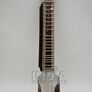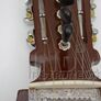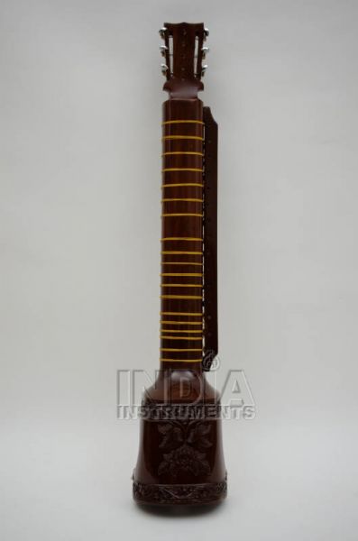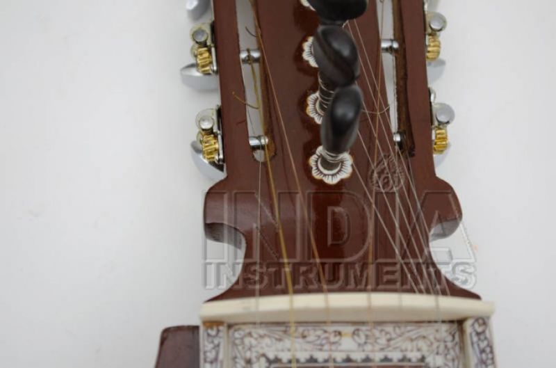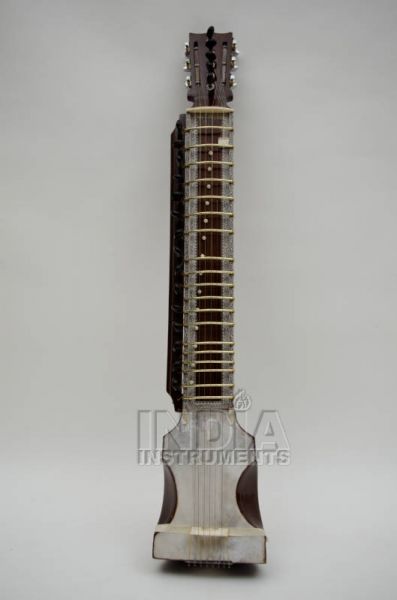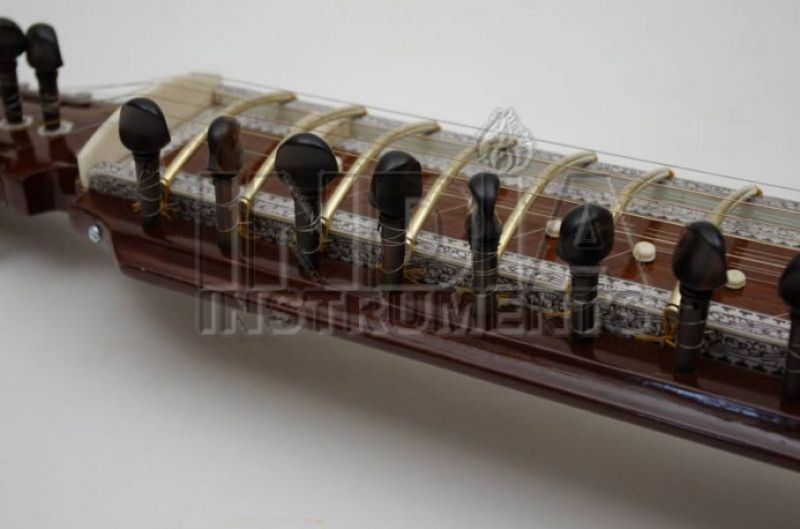 Dunkel gebeiztes Tun-Holz, hochglanzpolierte Schelllackoberflächen, Korpusbespannung aus Ziegenhaut, Stege und Brücke aus Kunststoff, Bünde aus Neusilber, Wirbelkopf mit 6 Mechaniken für die Spielsaiten und 5 Resonanzsaitenwirbeln, 15 Resonanzsaitenwirbel auf seitlich angeschraubter Leiste, Saitenhalter aus Metall, Einlegearbeiten aus graviertem Zelluloid, Korpusrückseite mit geschnitzter Verzierung.