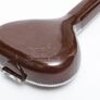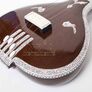 Tun-Holz, Hornbrücke, vier Spielsaiten, hochglanzpolierte Schelllackoberflächen, mittel- bis dunkelbraun gebeizt, flacher Holzkorpus, Einlegearbeiten aus Zelluloid, keine Verzierung