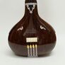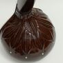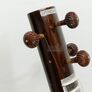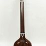 Tun-Holz, Hornbrücke, vier Spielsaiten, hochglanzpolierte Schelllackoberflächen, dunkel gebeizt, Korpus aus Kürbis, Einlegearbeiten aus Zelluloid, Halsansatz hinten ohne Verzierung.