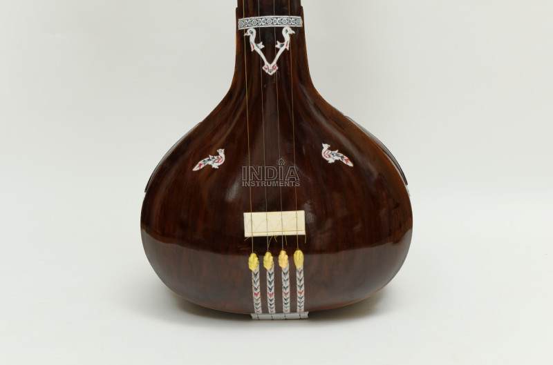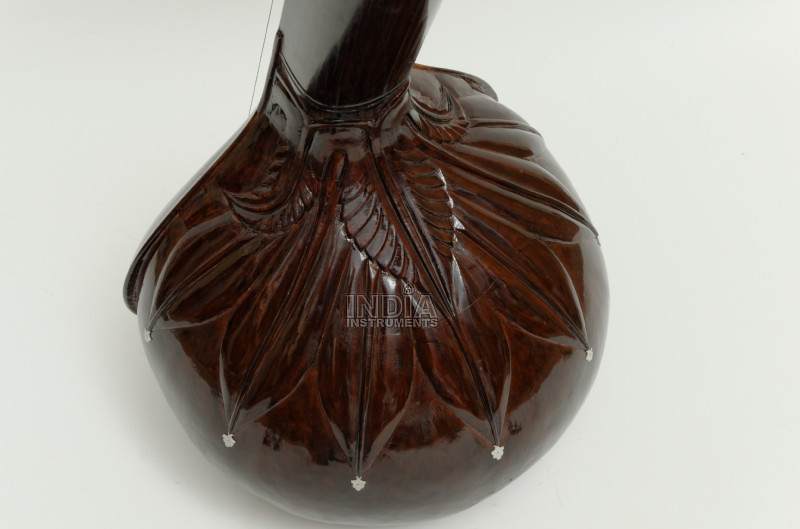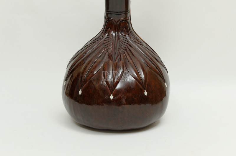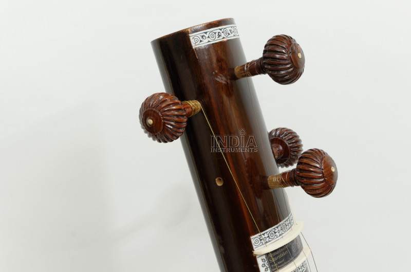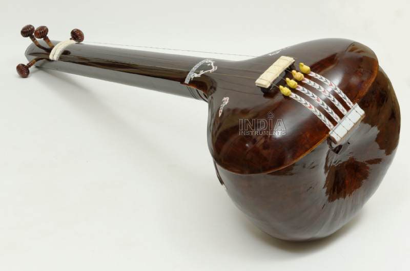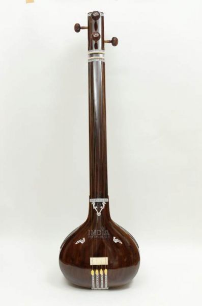 Sie ist spürbar schwerer gebaut als vergleichbare Tanpuras aus Kalkutta. Vielleicht liegt darin ihr Geheimnis. Die schlichte Verzierung im Stil des frühen 20. Jahrhunderts und die komplett dunkle Lackierung geben ihr ein archaisch anmutendes Erscheinungsbild. Die Verarbeitungsqualität der Lackoberflächen und der Holzarbeiten ist deutlich einfacher als bei anderen Markentanpuras - alle Äußerlichkeiten sind hier der Suche nach dem vollkommenen Klang untergeordnet. Standardgrundton um C - D.